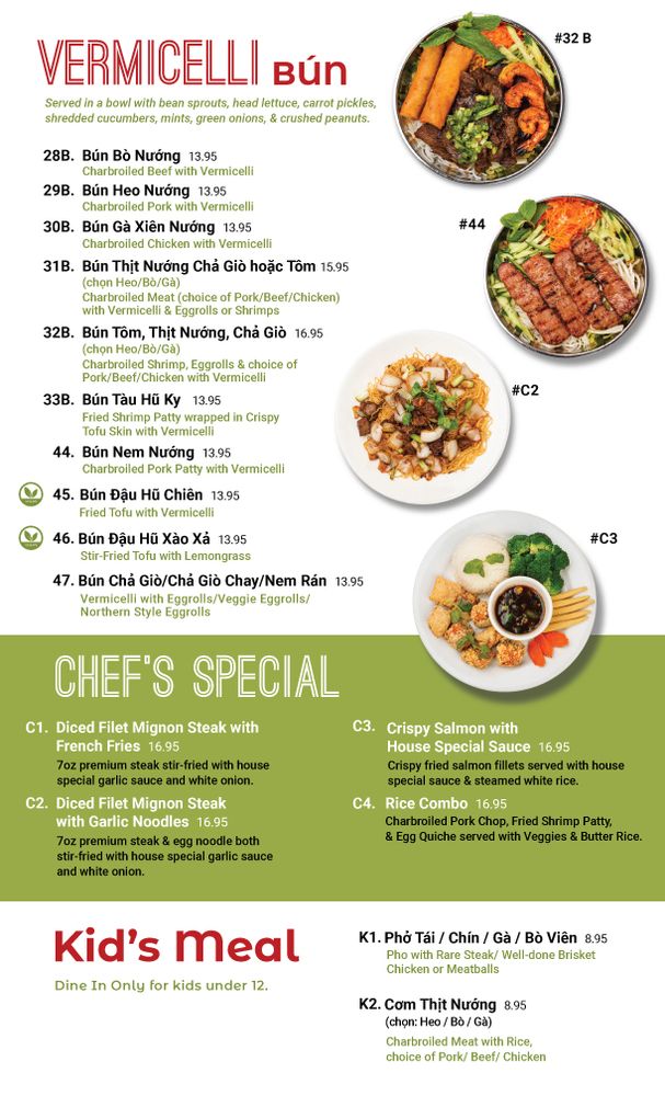 Bun Tom, Thit Nuong, Cha Gio (Chon: Heo / Bo/ Ga)